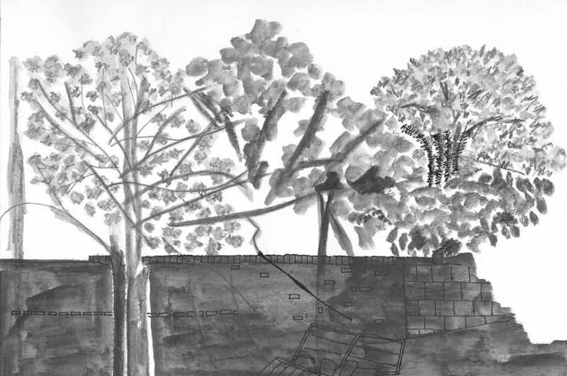 This drawing shows the old wall backing on to gardens overlooking the railway and I used mostly water soluble pencils plus black pen.
